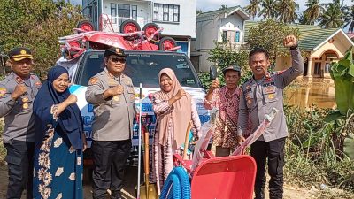 Bantuan yang diantarkan meliputi 710 buah cangkul + tangkai, 710 buah sekop, 1016 buah sepatu boot, 50 meter slang sedot air, 20 unit mesin sedot air, dan 2000 buah pel lantai karet. Sebelum diantarkan ke posko, bantuan tersebut diterima oleh Kepala Biro Logistik Polda Sumbar Kombes Pol Faried Zulkarnain.Sik di gudang Rolog polda Sumbar.