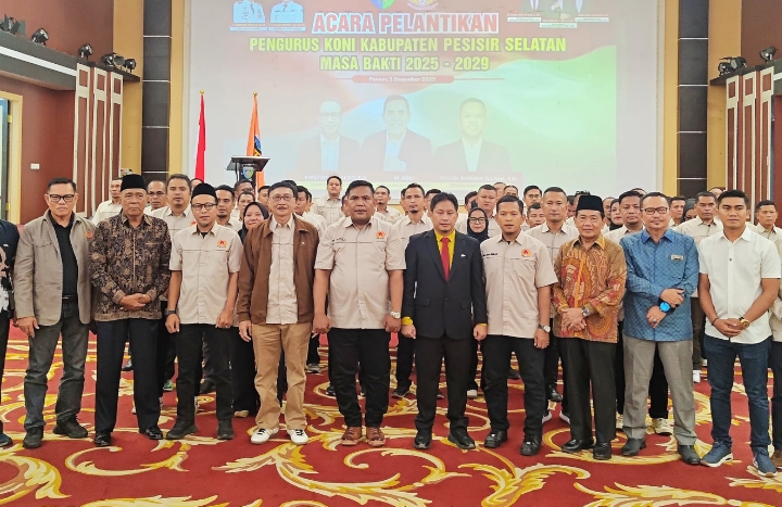 Painan, Rakyat Sumbar— Pengurus harian Komite Olahraga Nasional Indonesia (KONI) Kabupaten Pesisir Selatan masa bakti 2025–2029 resmi dilantik dalam upacara khidmat di Komplek Gedung Painan Convention Center (PCC), Jalan H Agus Salim, Painan, Rabu malam (3/12/2025).