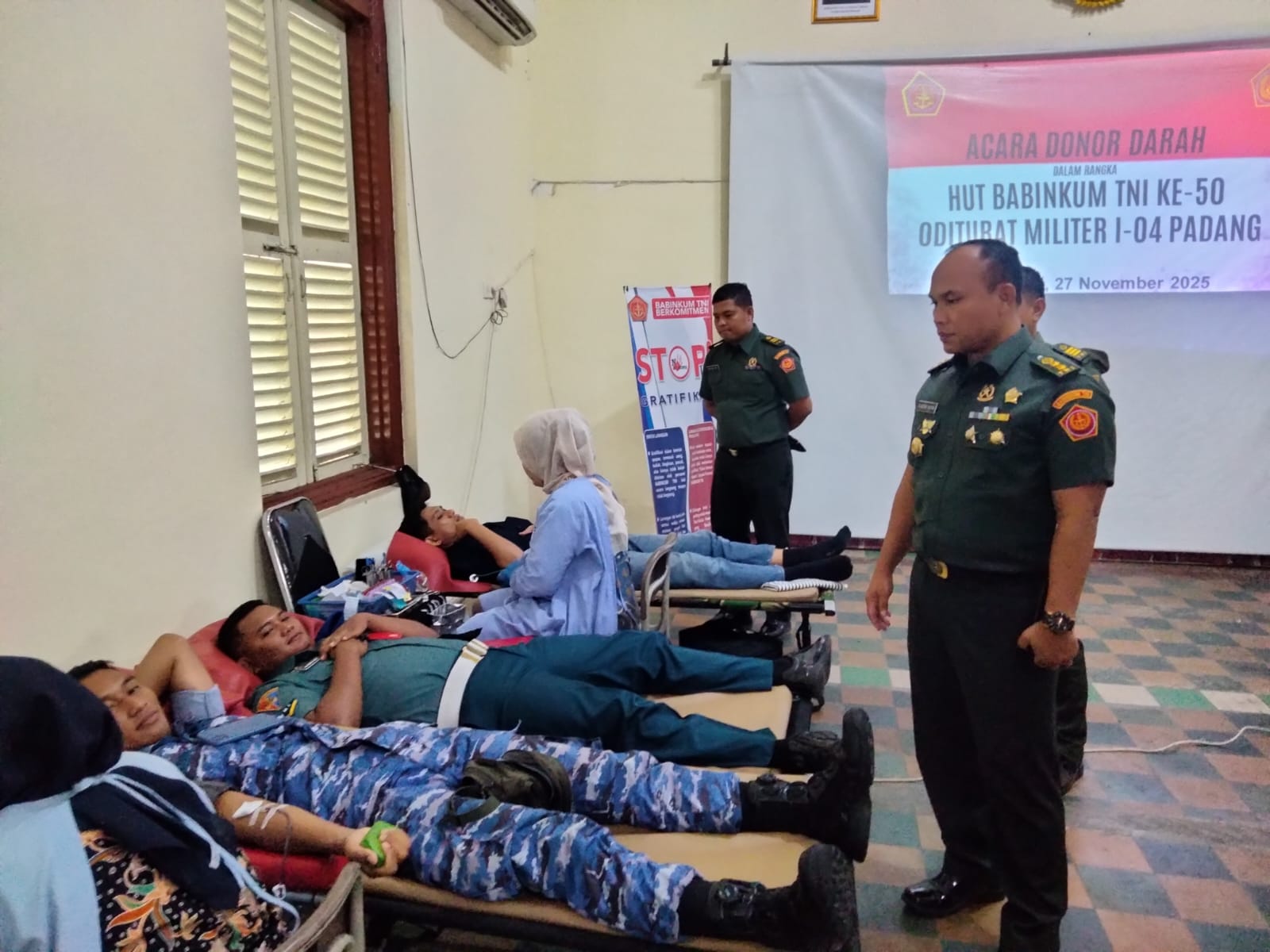 Padang, Rakyat Sumbar–Sebagai bagian dari rangkaian perayaan Hari Ulang Tahun ke-50 Badan Pembinaan Hukum Tentara Nasional Indonesia (Babinkum TNI) yang jatuh pada 3 Desember 2025 mendatang, Oditurat Militer (Otmil) I-04 Padang menggelar kegiatan donor darah yang berlangsung di Kantor Otmil I-04 Padang, di Jl Sudirman Padang. Kamis (27/11)