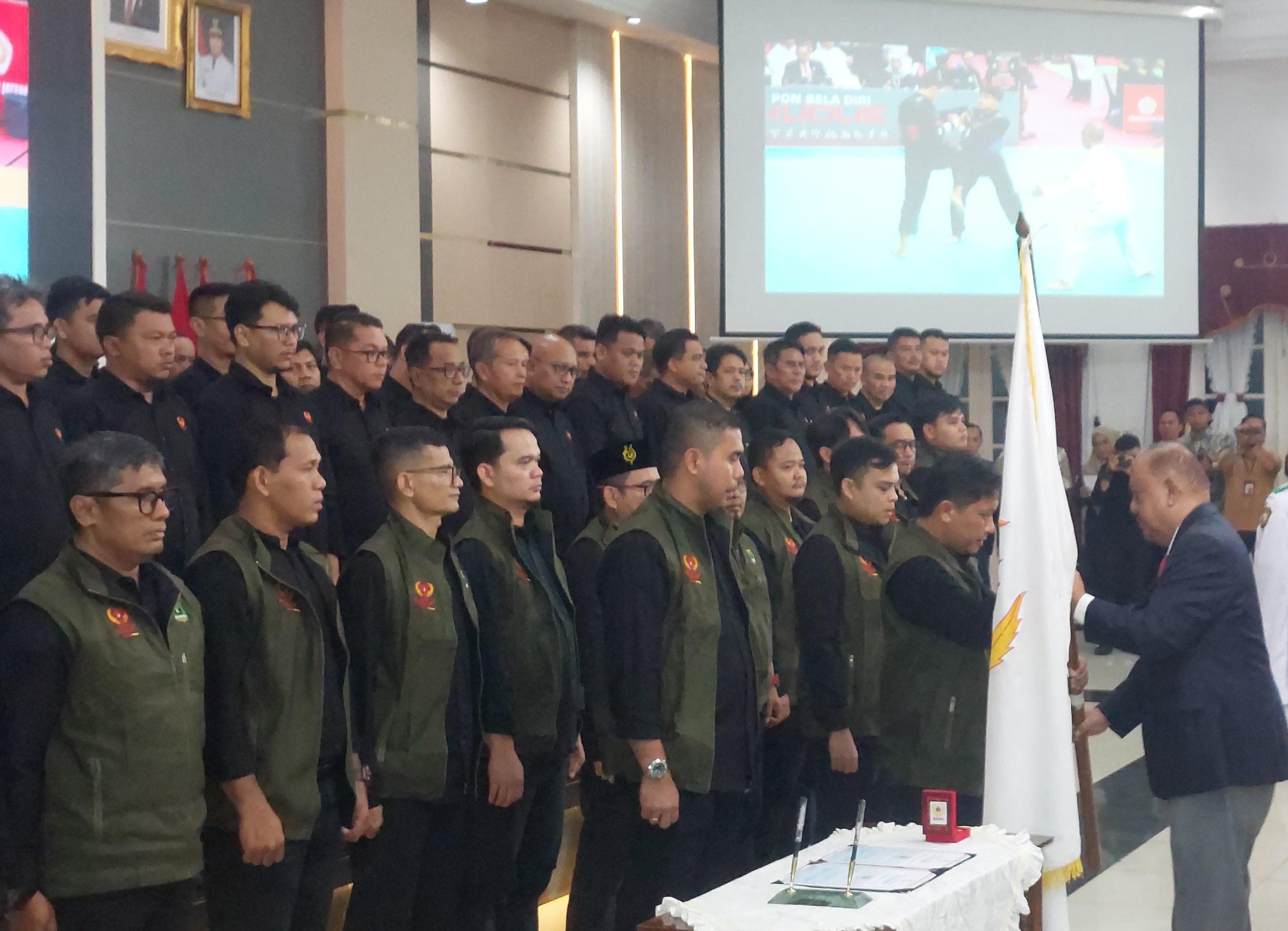 Ketua Umum KONI Pusat Marciano Norman menyerahkan Pataka kepada Ketua KONI Sumbar Hamdanus, saat pelantikan Pengurus KONI Sumbar 2025-2029 di Auditorium Istana Gubernur, Padang, Rabu, (5/11) malam. HANDIYANUAR/RAKYATSUMBAR.