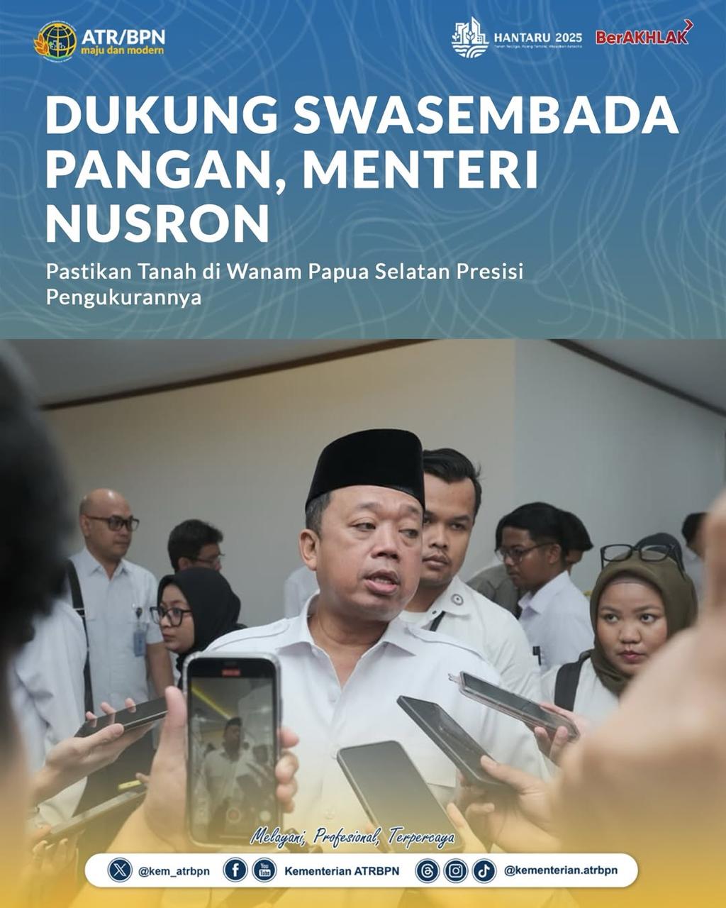 JAKARTA, Rakyat Sumbar—Kementerian Agraria dan Tata Ruang/Badan Pertanahan Nasional (ATR/BPN) menegaskan komitmennya dalam mendukung program swasembada pangan nasional di kawasan Wanam, Kabupaten Merauke, Papua Selatan. Menteri ATR/Kepala BPN, Nusron Wahid, memastikan bahwa seluruh tanah hasil pelepasan kawasan hutan di wilayah tersebut telah diukur secara presisi agar tidak menimbulkan sengketa atau masalah di kemudian hari.