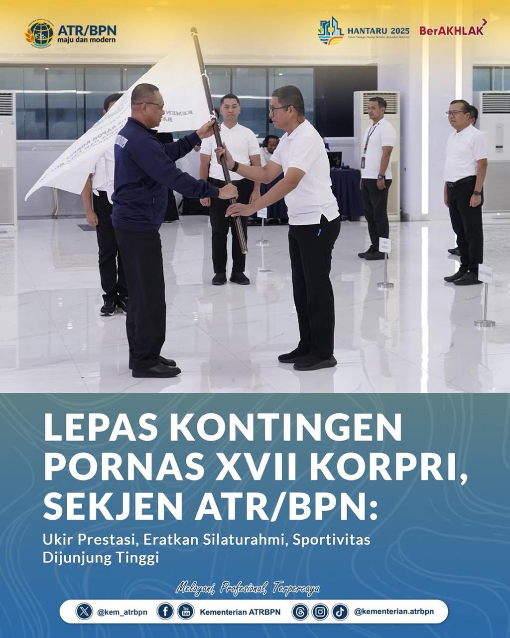JAKARTA, Rakyat Sumbar— Sekretaris Jenderal Kementerian Agraria dan Tata Ruang/Badan Pertanahan Nasional (ATR/BPN) Pudji Prasetijanto Hadi secara resmi melepas kontingen Kementerian ATR/BPN yang akan berlaga pada Pekan Olahraga Nasional (PORNAS) Korps Pegawai Republik Indonesia (KORPRI) XVII Tahun 2025 di Sumatra Selatan.