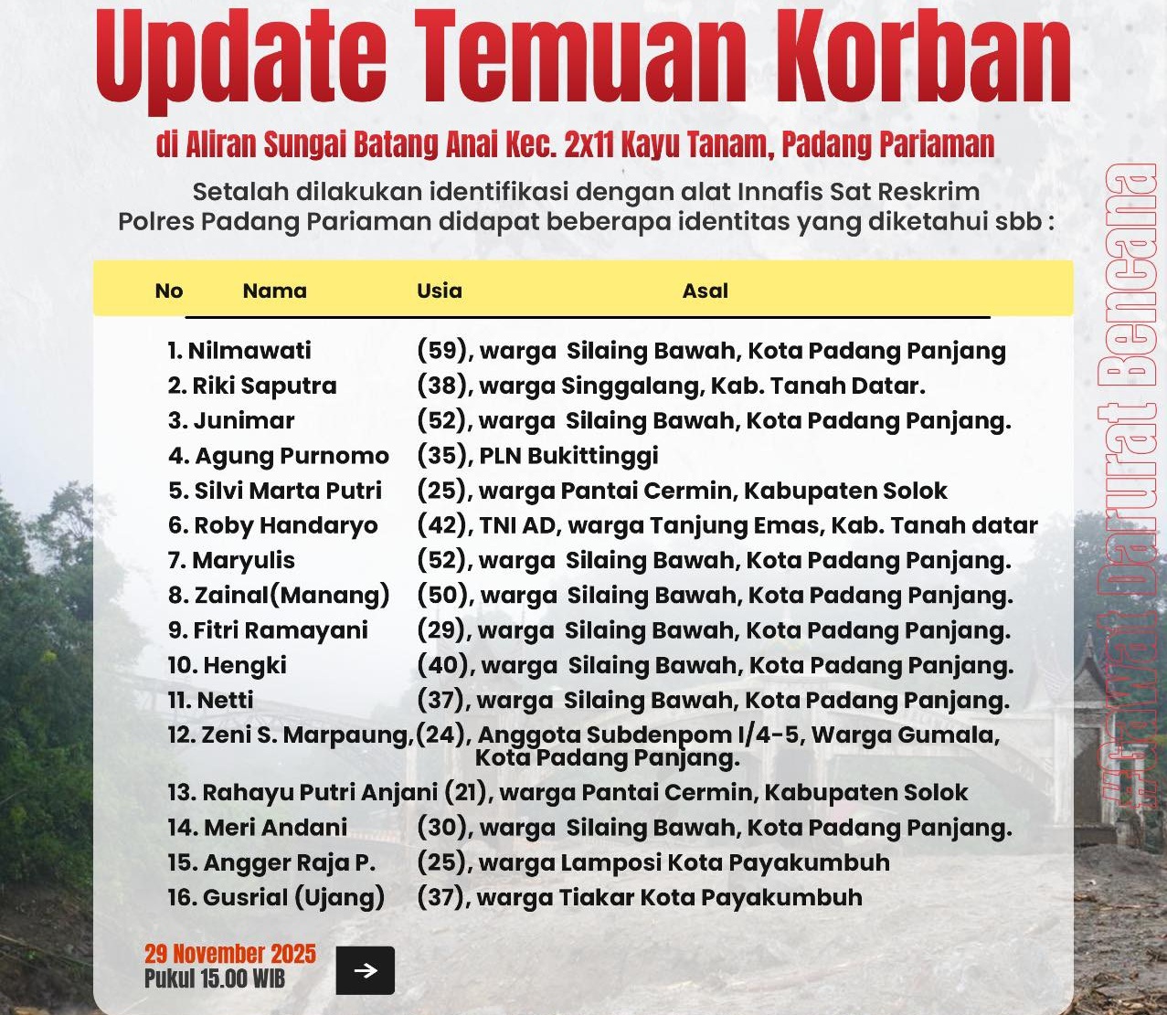 “Kondisi di lapangan masih labil. Tim gabungan bekerja maksimal tanpa henti untuk menuntaskan penyisiran dan memastikan seluruh korban dapat ditemukan. Kami mohon keluarga korban dan warga yang ingin melihat proses evakuasi agar menunggu di tempat yang aman. Serahkan semuanya kepada tim yang sudah terlatih. Keselamatan masyarakat adalah yang utama,” tegasnya.