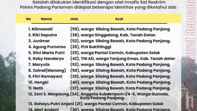 Kartyana mengungkapkan, korban yang ditemukan saat ini berada di ruang jenazah RSUD Padangpanjang, sedang diadakan proses identifikasi oleh Tim DVI gabungan.