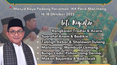 Padangpariaman, rakyatsumbar.id—Tim Kesenian Sholawat Dulang Topan Singgalang dan Group Sholawat Dulang Badai Tornado asal Padangpariaman bakal tampil menyemarakkan Festival Mauluik Gadang yang digelar Pemkab Padangpariaman, dari tanggal 16 sampai 18 Oktober 2025.