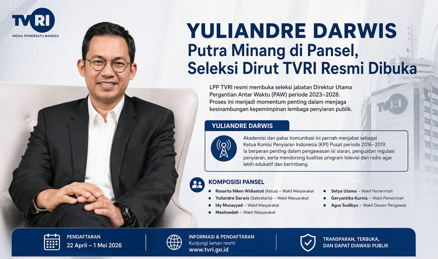 Kehadiran Yuliandre Darwis—putra Minangkabau—dalam struktur Pansel ini menjadi penanda penting keterlibatan figur daerah di panggung strategis nasional. Dengan pengalaman memimpin KPI dan latar akademik komunikasi, ia diharapkan ikut memastikan proses seleksi berjalan kredibel serta menghasilkan pemimpin TVRI yang adaptif, independen, dan berorientasi pada kepentingan publik.(*)